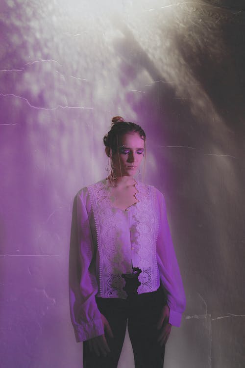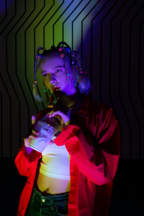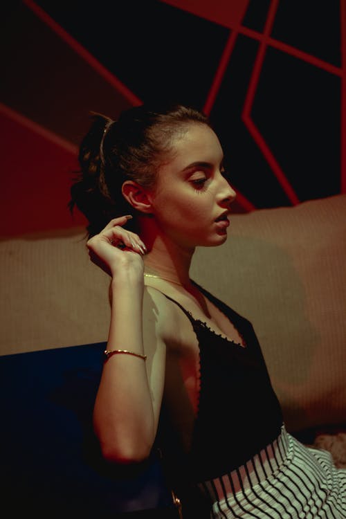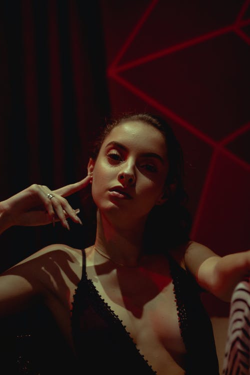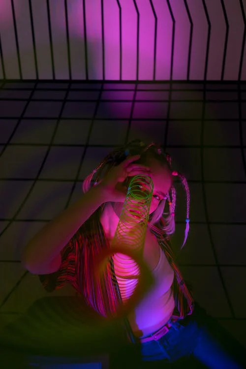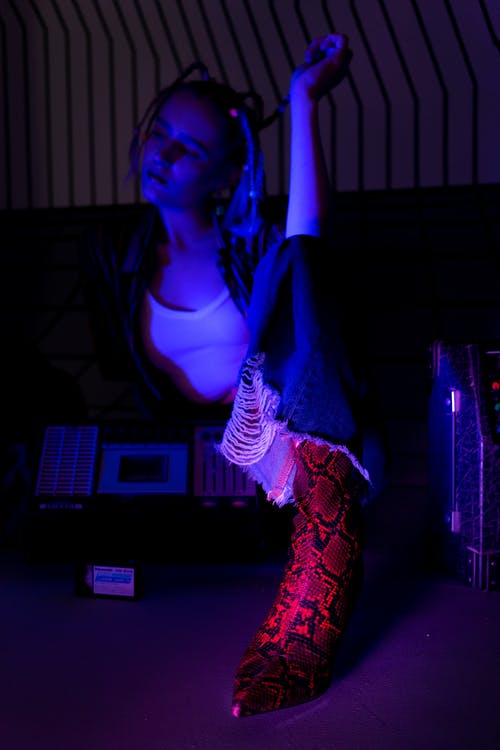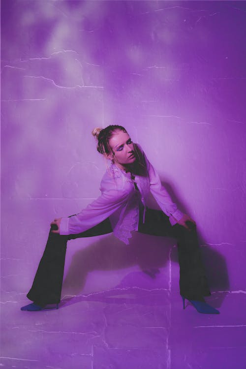 Beautiful dance of Hanna in neon lights with retro effect. Pink lights, pretty women and sensuality.